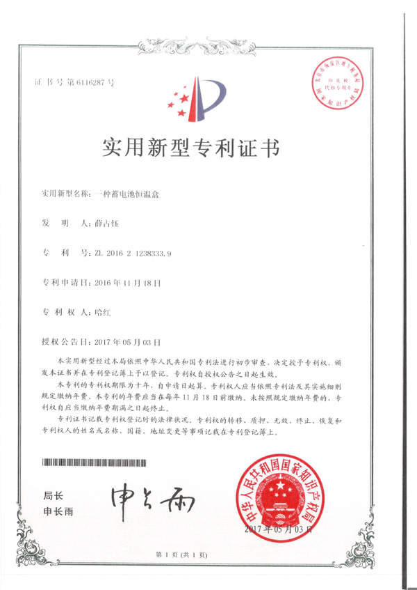 一種蓄電池恒溫盒實(shí)用新型專(zhuān)利證書(shū)