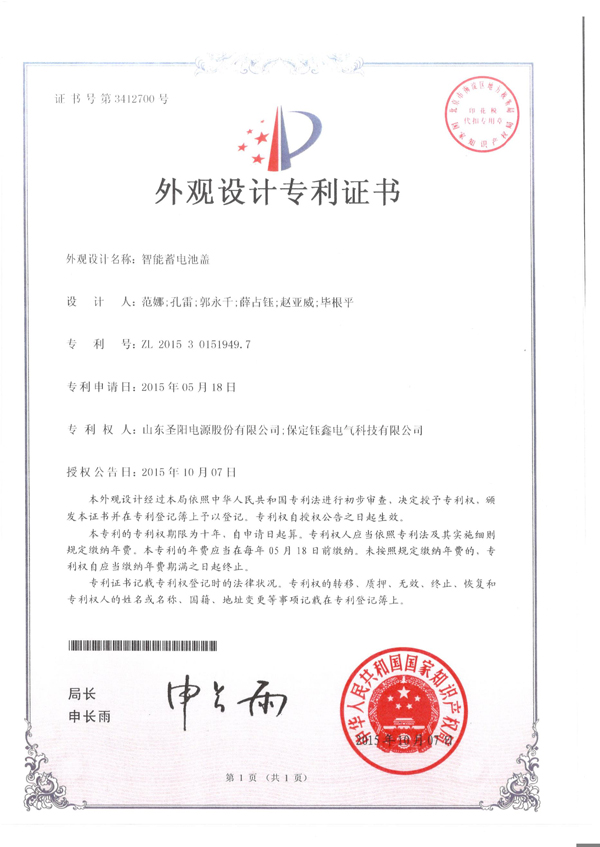 智能蓄電池蓋外觀設(shè)計(jì)專利證書
