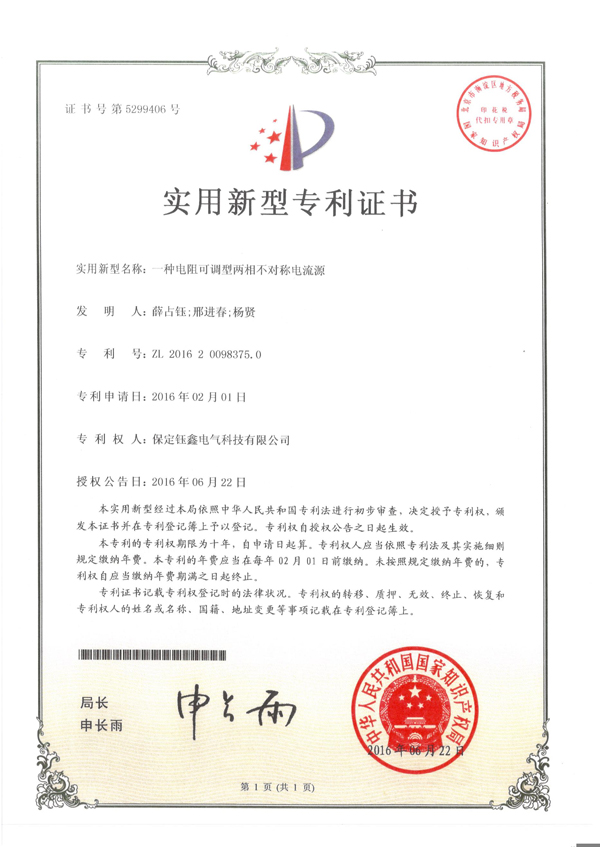 實(shí)用新型名稱:一種電阻可調(diào)型兩相不對(duì)稱電流源,專利號(hào):ZL 2016 2 0098375.0,專利申請(qǐng)日:2016年02月01日,專利權(quán)人:保定鈺鑫電氣科技有限公司,授權(quán)公告日:2016年06月22日