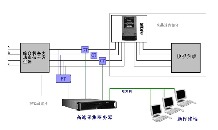 本平臺大概包括三部分:1、現(xiàn)場環(huán)境模擬試驗臺。2、精準測量部分(應(yīng)用于電能表實驗室的高速采集服務(wù)器)。3、溫度可調(diào)的防暴試驗箱。
